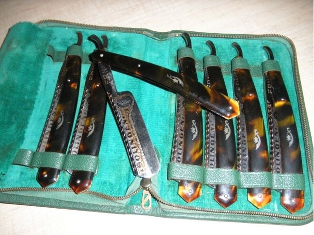 Selling antique straight 3/4" razors.This razors were made in the 50's.Razors made by ERN Solingen,Germany.The razors have have Trutle shell scales.The scales are three pin type.